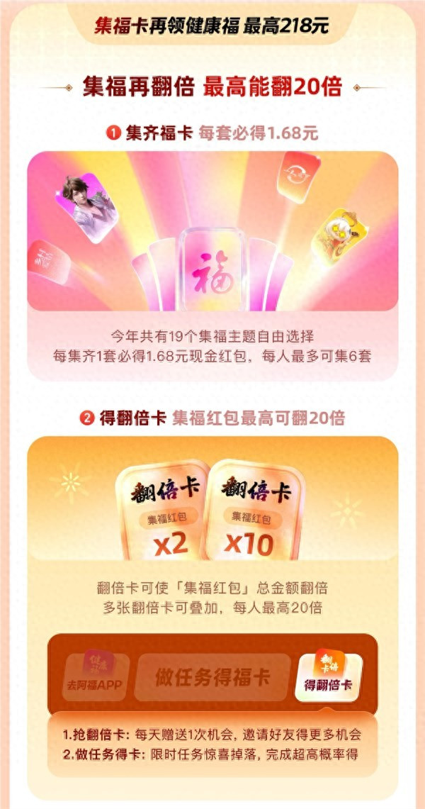 据悉,本次集福活动共推出19套主题福卡,涵盖经典五福及游戏、潮玩、影视等多元领域IP。用户可自由选择其中6套进行收集,每集齐一套即可获得1.68元红包。为增加趣味性,活动还设置了2倍和10倍翻倍卡,所有集福红包将于除夕夜22:18统一开奖。